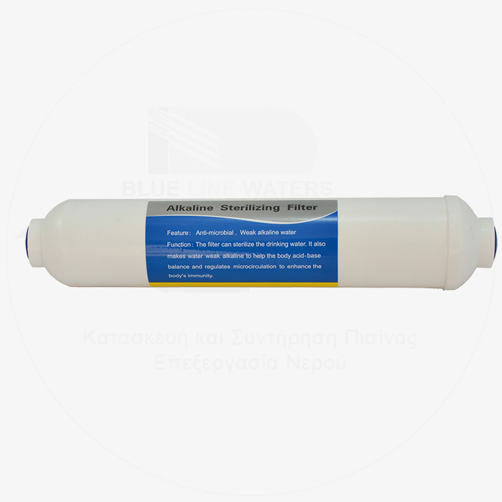 Alkaline and sterilizing filter for added alkalinity that improves taste. Suitable for reverse osmosis systems.